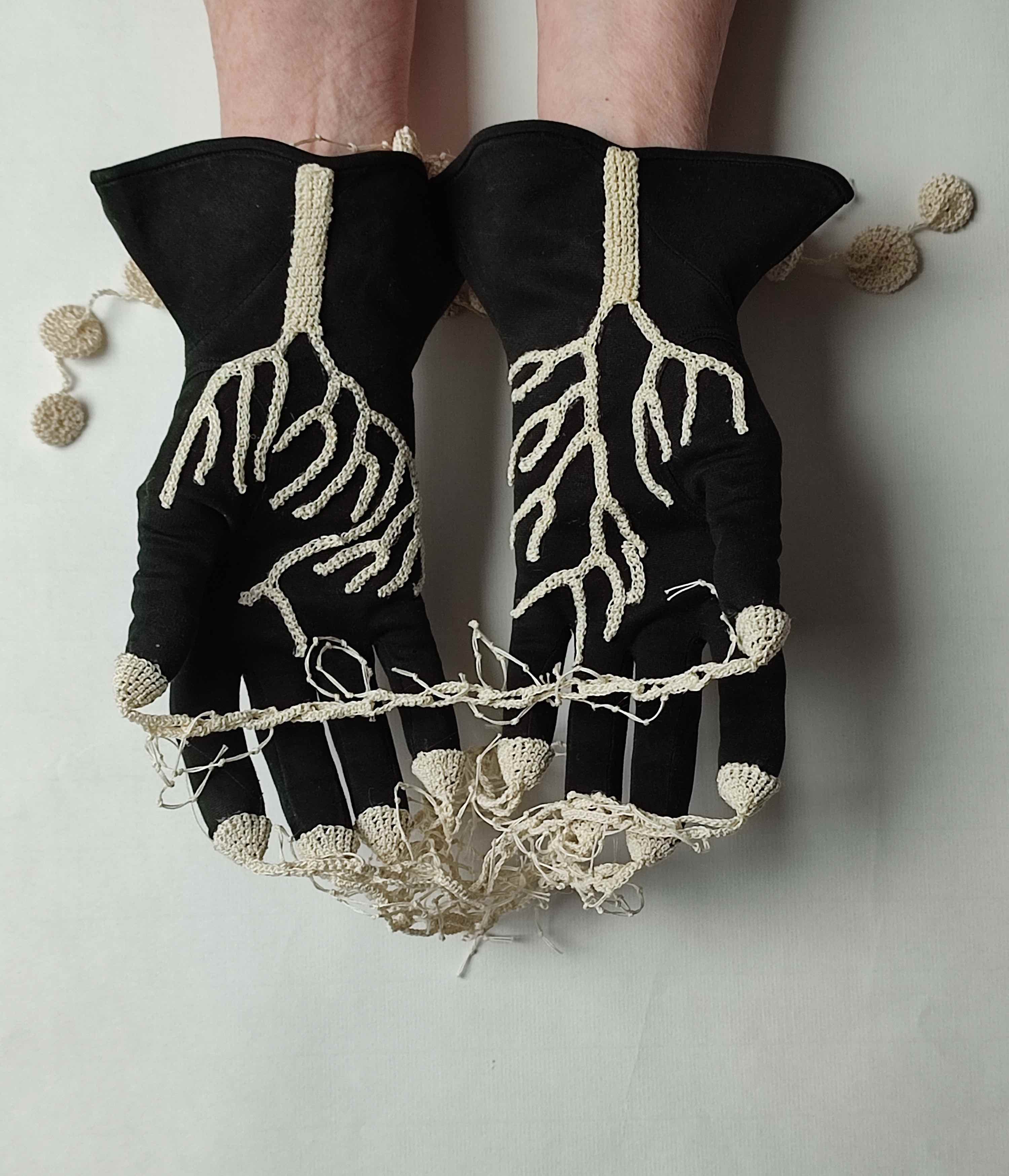 Gathering energy (broderie sur gants de coton, soie crochetée)